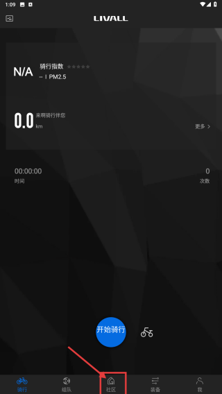 1、打开骑行社交应用,点击底部社区选项,进入社区页面。