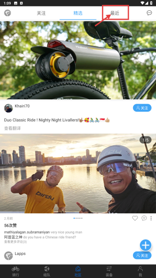 2、在社区页面,点击最近板块,浏览最近的骑行动态。
