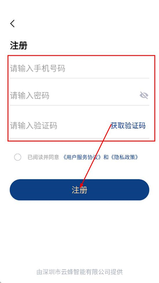 4、在注册页面,依次填写手机号和密码、验证码,点击注册,完成账号注册。