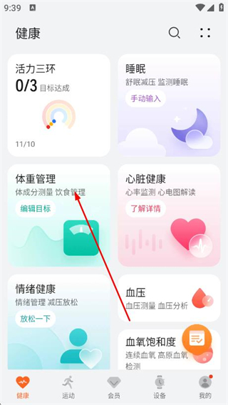 1、打开华为运动健康APP,在健康页面点击体重管理,进入体重管理界面。