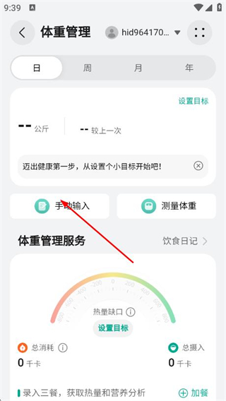 2、在体重管理界面点击手动输入,进入体重手动输入页面。