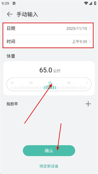 3、设置日期、时间,调整体重数值,点击确认,即可完成体重记录。