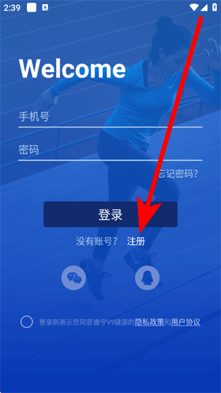 1、打开V9健康,在提示框,点击同意,进入登录界面。