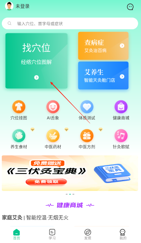 1、打开中医养生APP进入首页,点击找穴位功能,查看经络穴位图解,借助搜索框输入穴位症状等信息,快速查找对应养生知识,开启中医养生探索。
