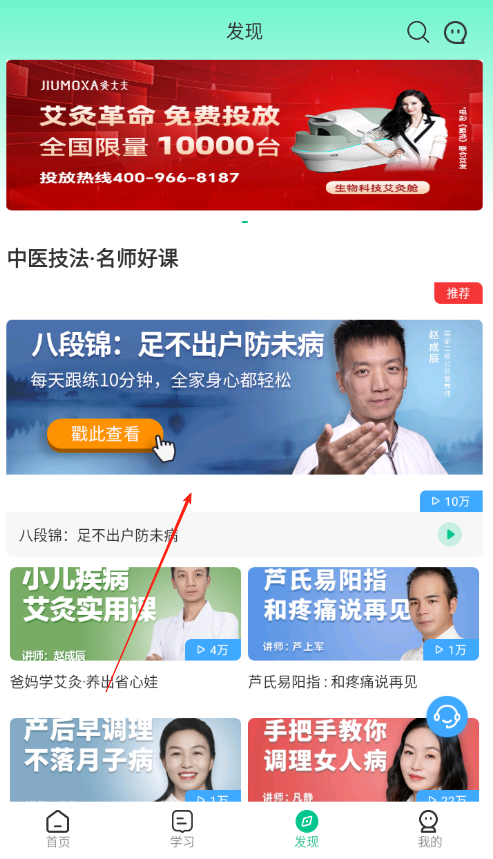 3、进入发现页面,选择中医技法名师好课,点击八段锦等课程,查看课程介绍播放量,点击播放跟练学习,利用底部导航切换功能模块,管理养生学习。