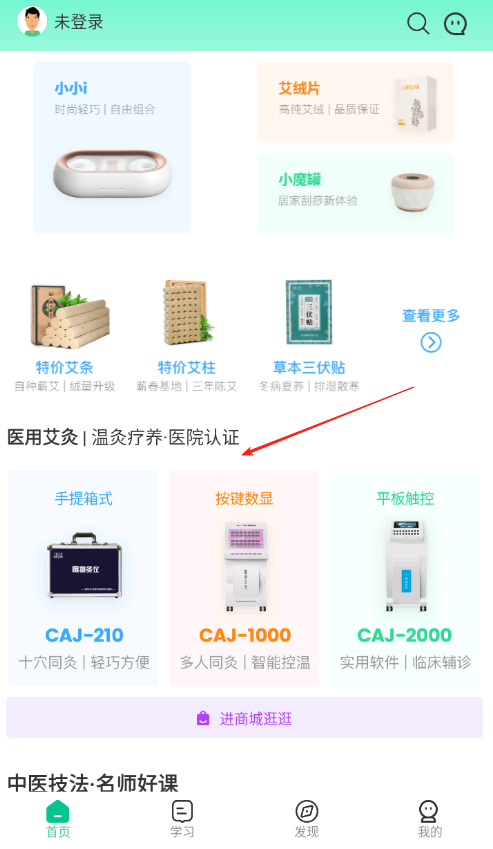 2、切换至健康商城页面,浏览艾灸产品医用设备,挑选小Ji艾绒片等商品,查看产品详情参数,按需下单选购,满足中医养生器具物资需求。