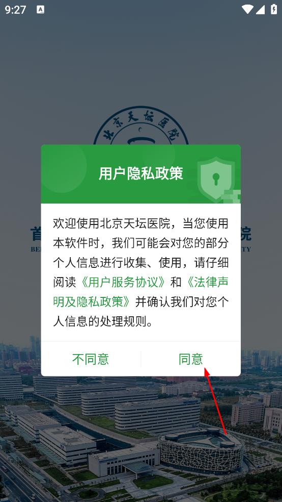 1、打开北京天坛医院APP,在弹出的用户隐私政策提示框中,点击“同意”按钮。