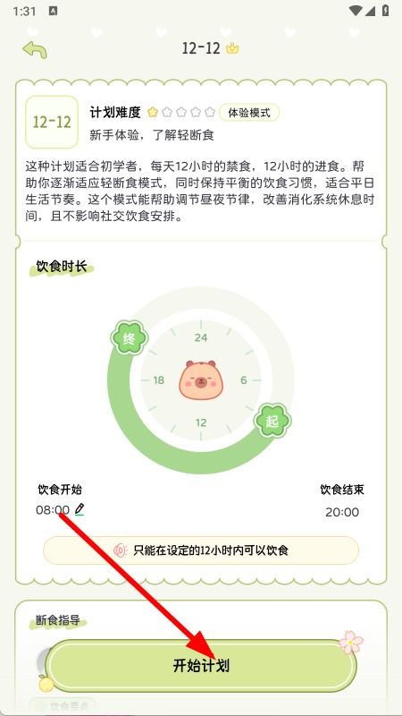 3、在计划详情页,点击开始计划按钮,进入饮食计时页面。