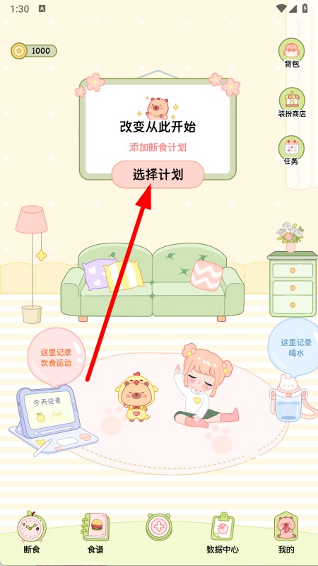 1、打开APP,在首页点击选择计划按钮,进入断食计划选择页面。