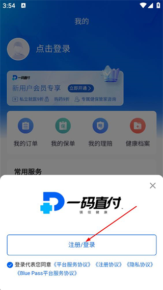 2、在我的页面,点击点击登录选项,弹出注册/登录弹窗。