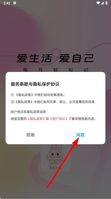 1、打开MIA经期APP,在弹出的页面点击同意。
