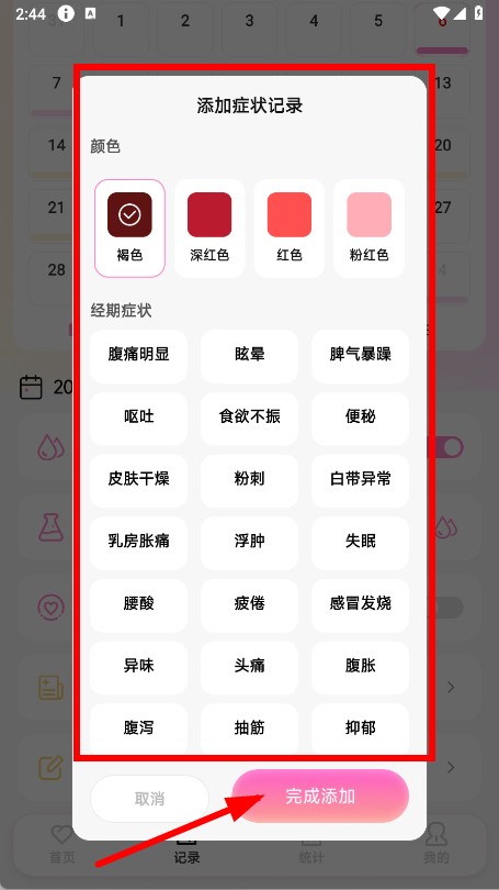 4、在添加症状记录页面,选择颜色和经期症状,然后点击完成添加。