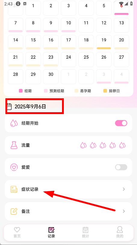 3、在记录页面,选择日期后,点击症状记录选项。