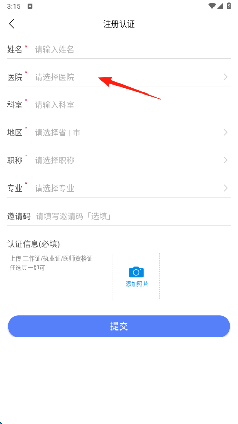 2、若选择我是医生,跳转至注册认证页面,依次填写姓名医院科室地区职称专业等信息,上传工作证执业证或医师资格证,确认无误点击提交。