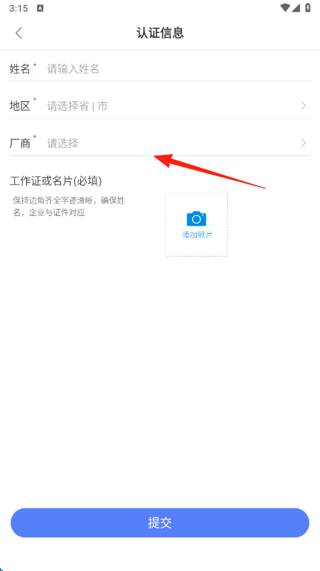 3、若选择我是医药器械厂商,进入认证信息页面,填写姓名地区,选择对应厂商,上传清晰的工作证或名片,核对信息后点击提交完成认证。