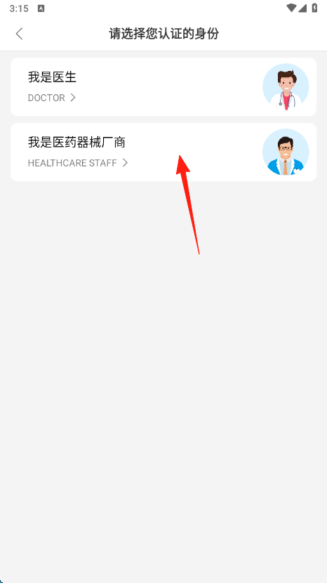 1、打开APP进入身份选择页面,根据实际身份点击我是医生或我是医药器械厂商选项,进入对应认证流程,开启身份认证第一步。