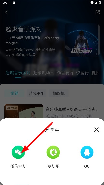 3、在超燃音乐派对课程详情页面,点击右上角的分享图标,弹出分享选项。