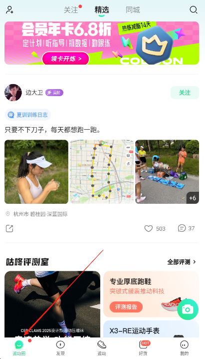 3、进入精选页面,查看会员年卡优惠信息,浏览用户发布的运动动态,如边大卫的夏训训练日志,点赞评论互动,还能查看咕咚评测室的运动装备评测,选购好货。