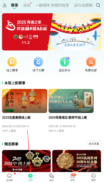2、切换至底部导航发现页面,进入赛事活动板块,查看线上赛事线下大赛等分类,浏览本周上新赛事精选赛事,了解活动规则报名情况,挑选感兴趣赛事参与。