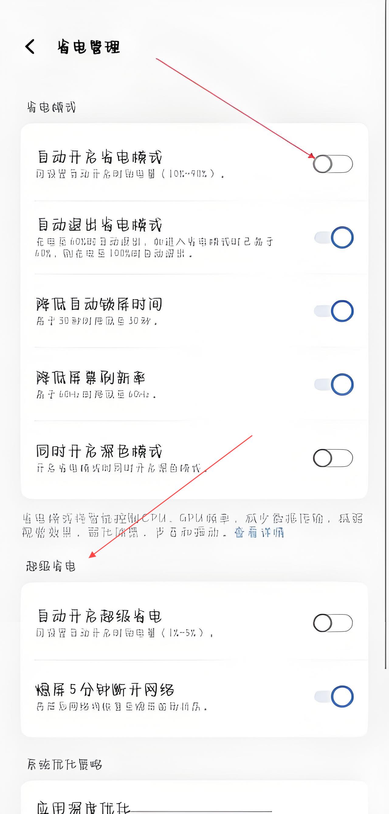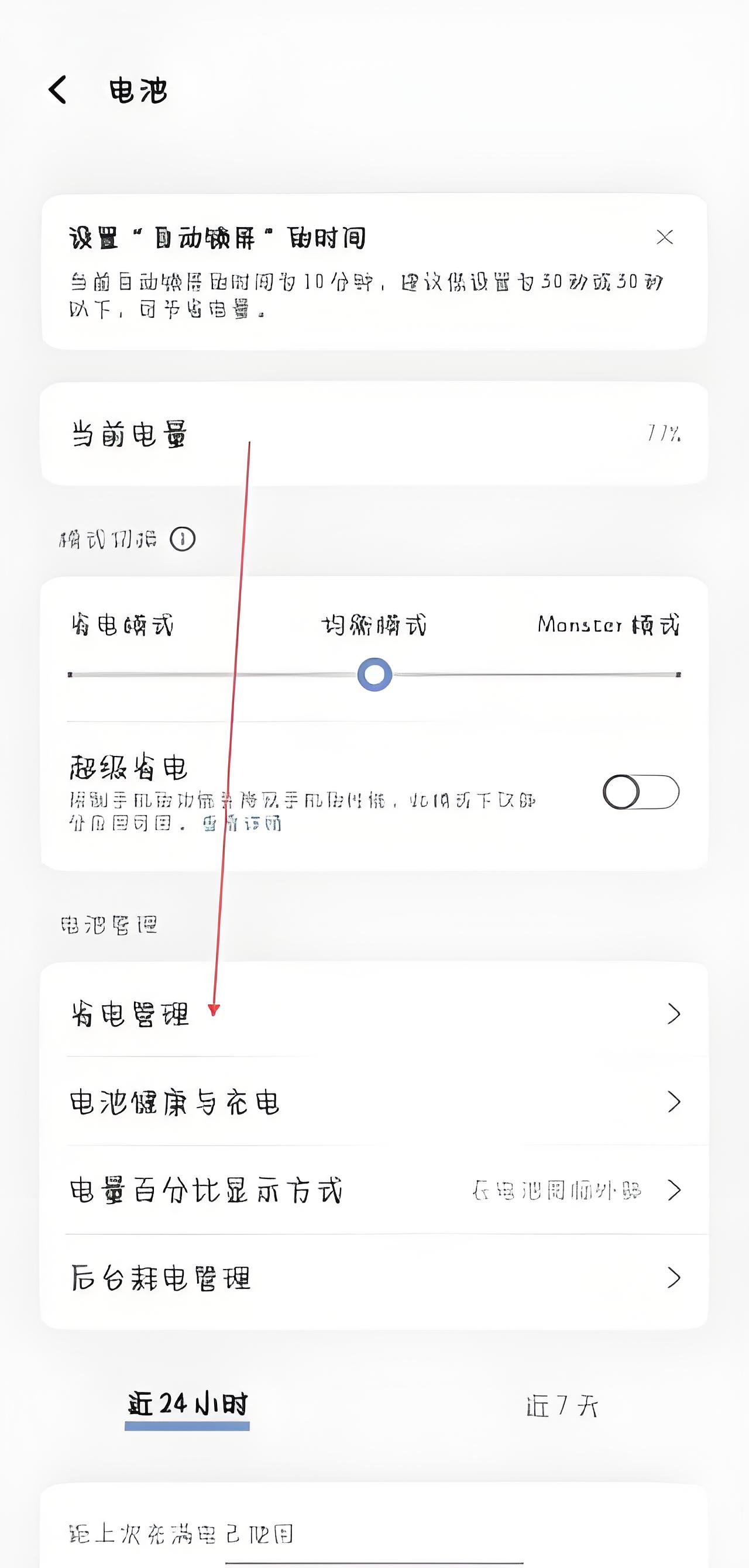 3、点击进入电池设置页面,在电池管理相关功能里找到并点击省电管理,之后便能按需开启自动开启省电模式、自动退出省电模式等功能。