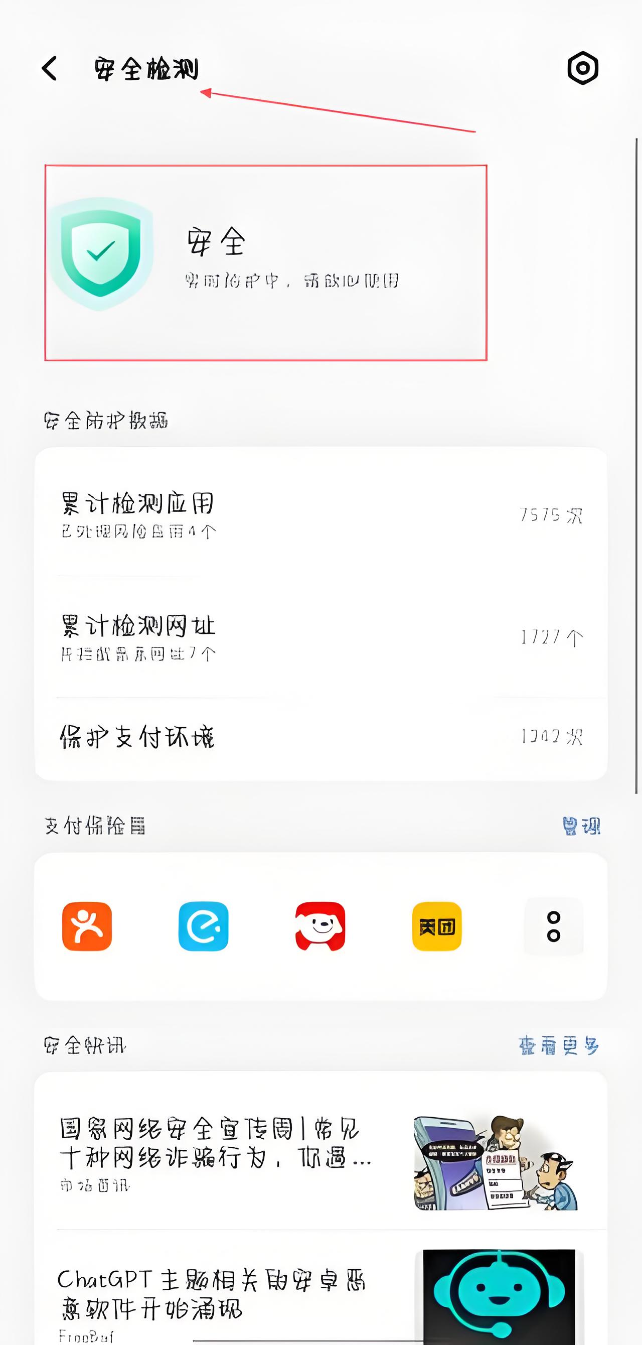 2、点击安全检测选项,进入安全检测页面,软件自动开始检测手机安全状态,完成后查看显示结果,了解累计检测应用次数、累计检测网址数量等数据,确认手机安全防护情况。