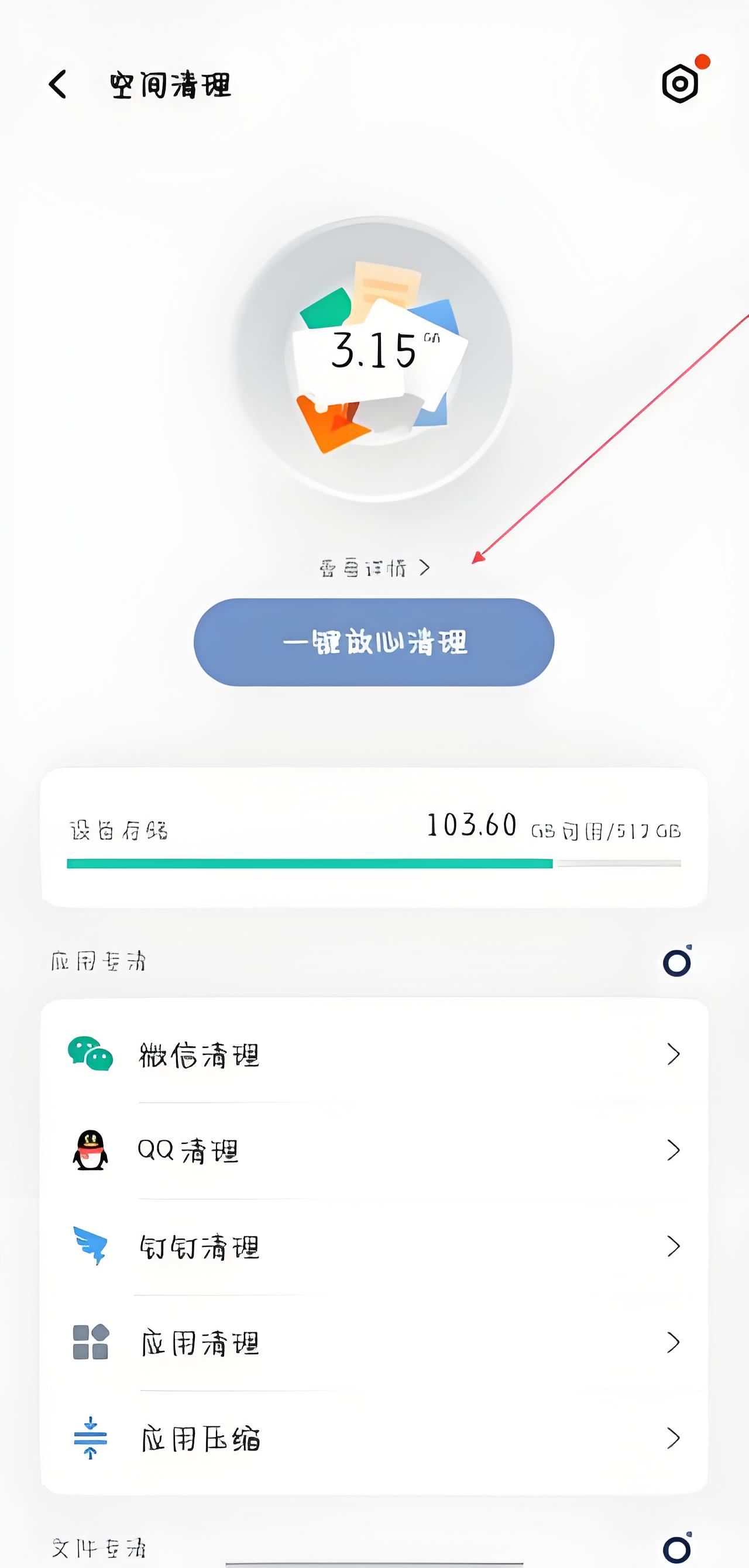 3、点击空间清理选项,软件会扫描手机可清理空间,显示垃圾总量,点击一键放心清理可快速处理常规垃圾,若想深入清理,点击查看详情,可针对微信QQ等应用进行专项清理。