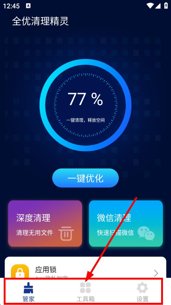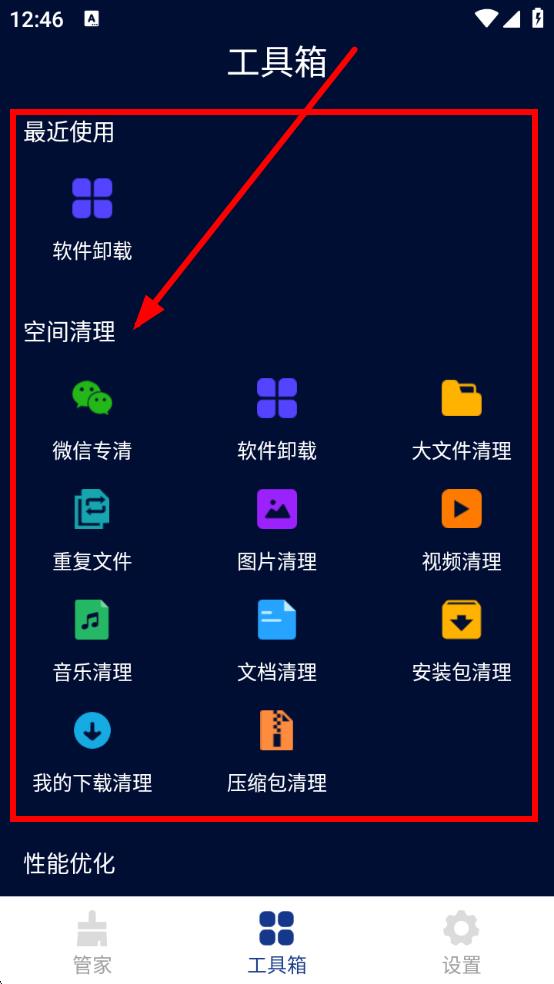 1、打开全优清理精灵,点击底部【工具箱】,进入工具选择界面,可按需使用各类清理功能。