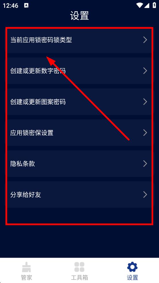 3、进入设置页,点击【当前应用锁密码锁类型】等选项,设置应用锁密码、隐私条款等,保障使用安全。