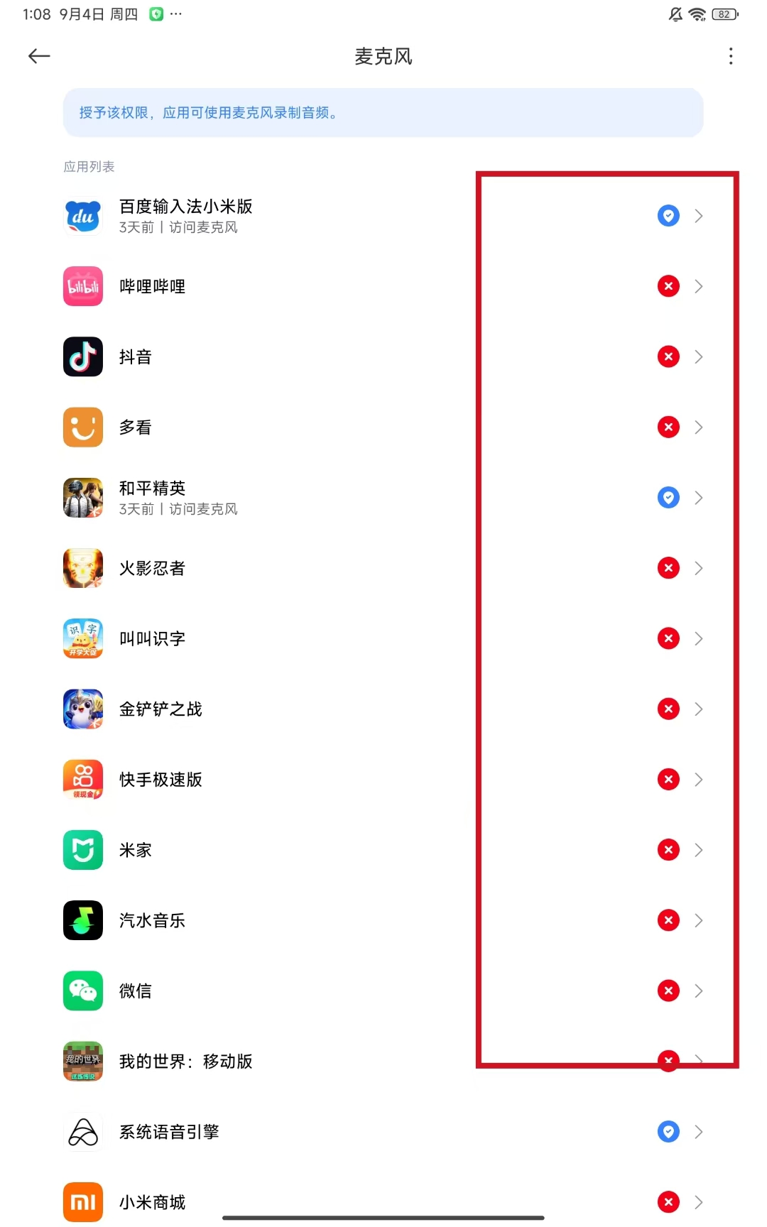 3、进入麦克风权限设置页面后,在应用列表里,可看到各个应用对麦克风权限的使用情况,点击应用右侧的开关,就能开启或关闭对应应用的麦克风权限。