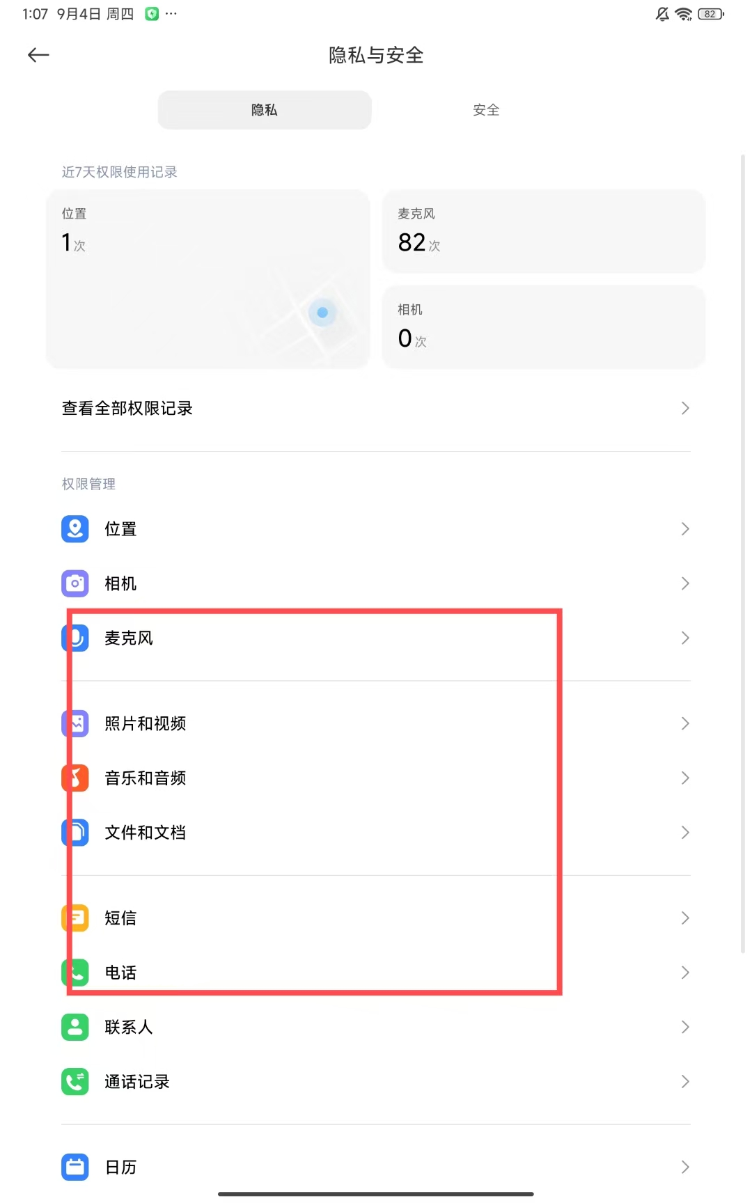 2、在隐私与安全页面的权限管理板块,能看到位置、相机、麦克风等多种权限选项,选择你想要设置的权限,比如点击麦克风选项。