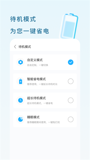 - 多样的待机模式自由选择设置,一键开启手机省电模式,智能省电模式、超长待机模式、睡眠模式等;