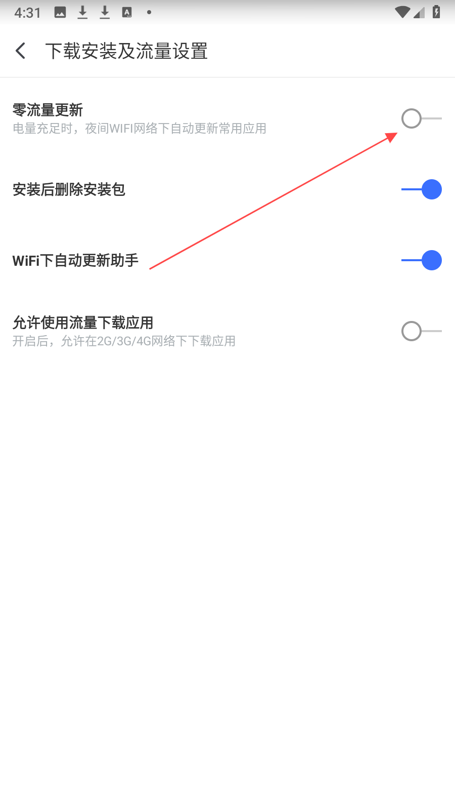 3、在下载安装及流量设置页面,将WiFi下自动更新助手开关开启;若希望在电量充足且夜间WIFI网络下自动更新常用应用,可开启零流量更新开关。