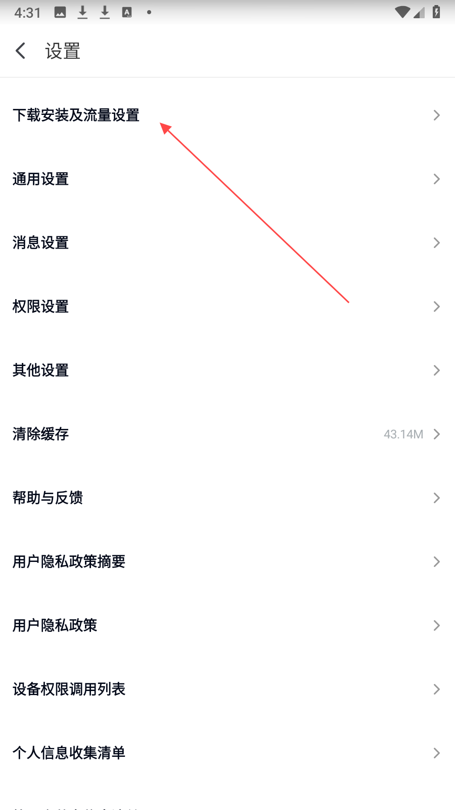2、在设置界面中,找到并点击下载安装及流量设置选项,进入下载安装及流量相关设置页面。