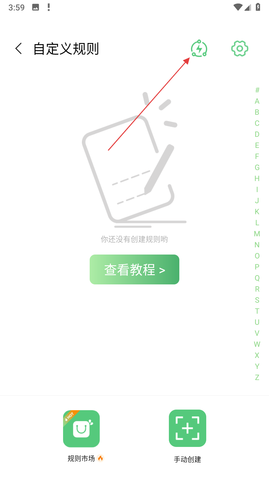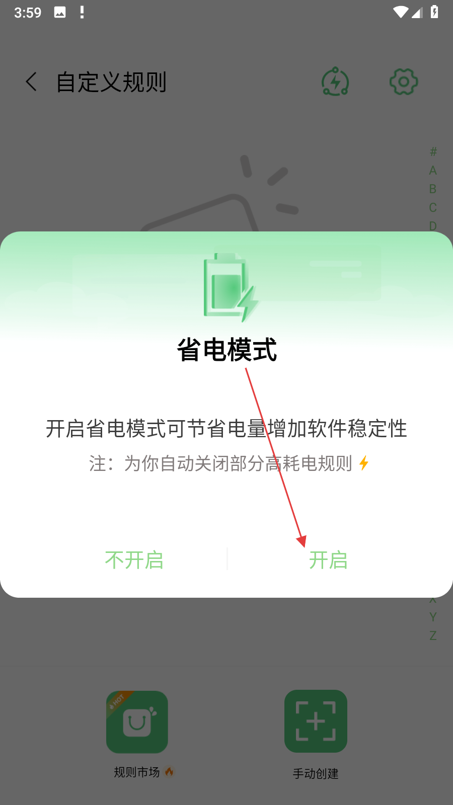 2、在自定义规则界面的右上角,点击带有闪电标志的图标,触发省电模式设置弹窗。