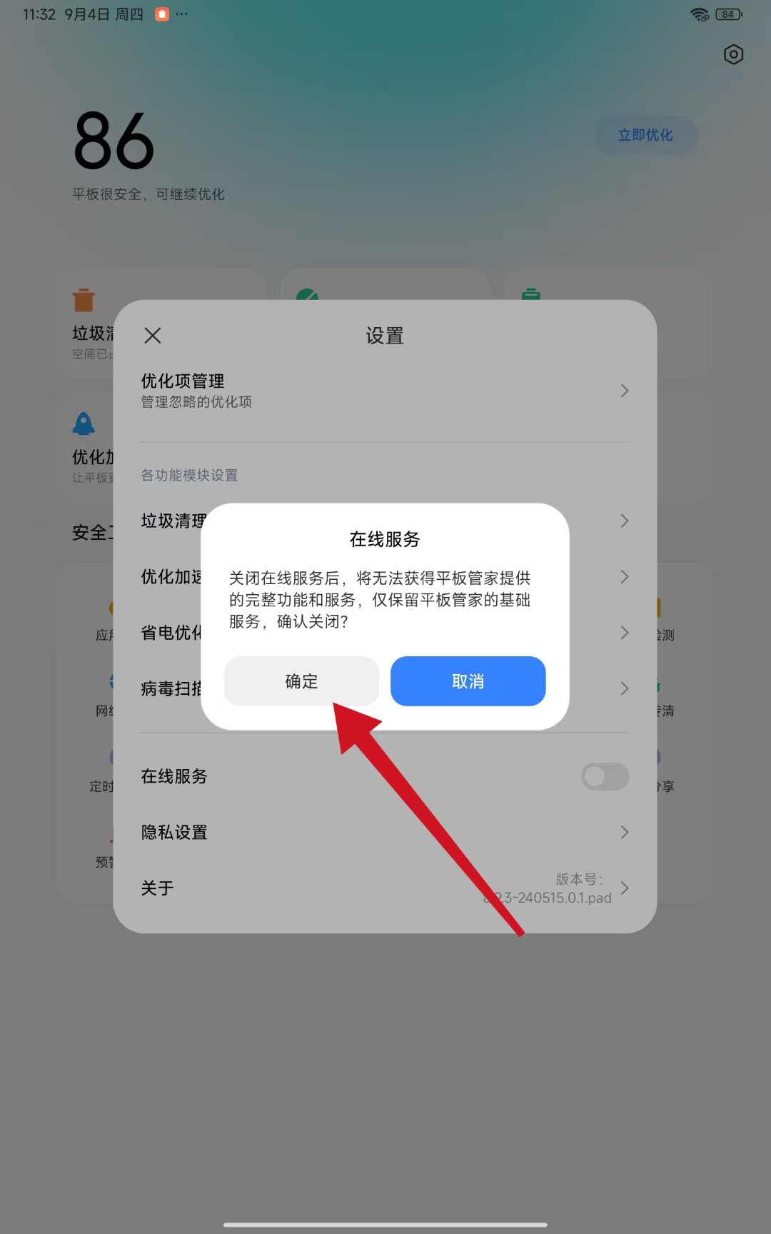 3、点击在线服务后的开关按钮,在弹出的确认窗口中,点击确定按钮,即可关闭小米手机管家的在线服务功能。