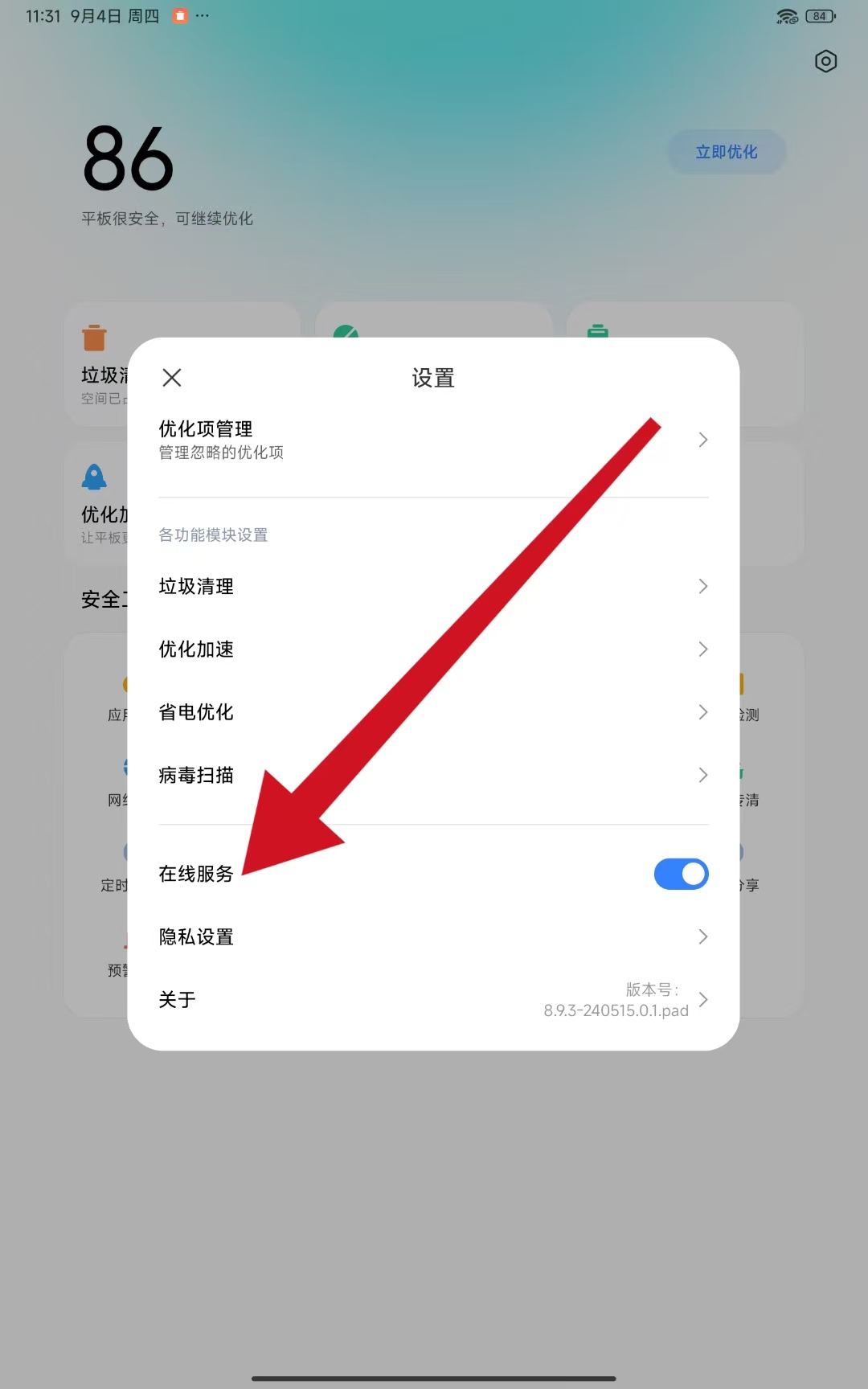 2、在设置页面中,找到并点击在线服务选项,该选项后有一个蓝色的开关按钮。