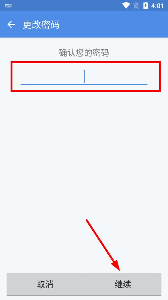 4、在确认您的密码界面,输入当前密码,点击继续。