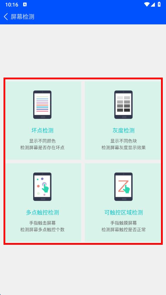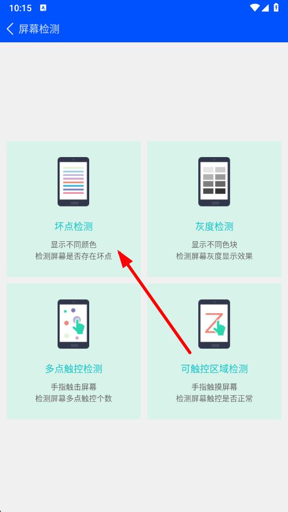 2、在屏幕检测界面,有坏点检测、灰度检测、多点触控检测、可触控区域检测多种检测功能,点击坏点检测选项。