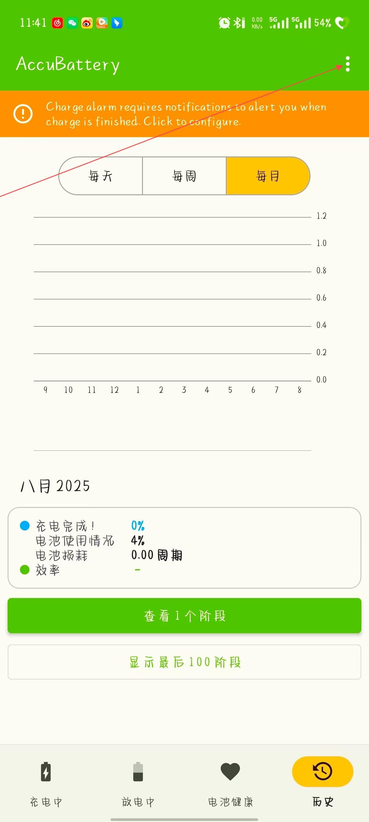 1、打开AccuBattery应用,点击界面右上角的三点菜单图标,打开功能菜单列表。