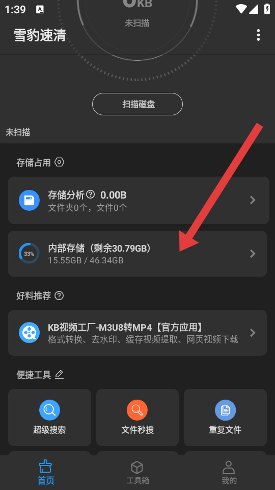 1、打开雪豹速清APP的首页,然后点击内部存储,进入设备存储文件的目录。