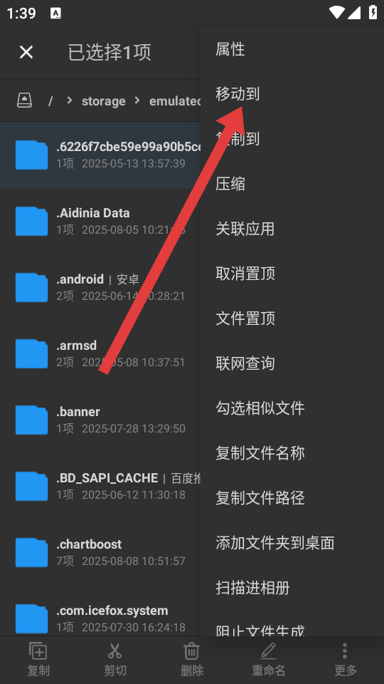 3、在弹出的菜单选项里,选择移动到,即可指定目标路径完成文件转移的操作。