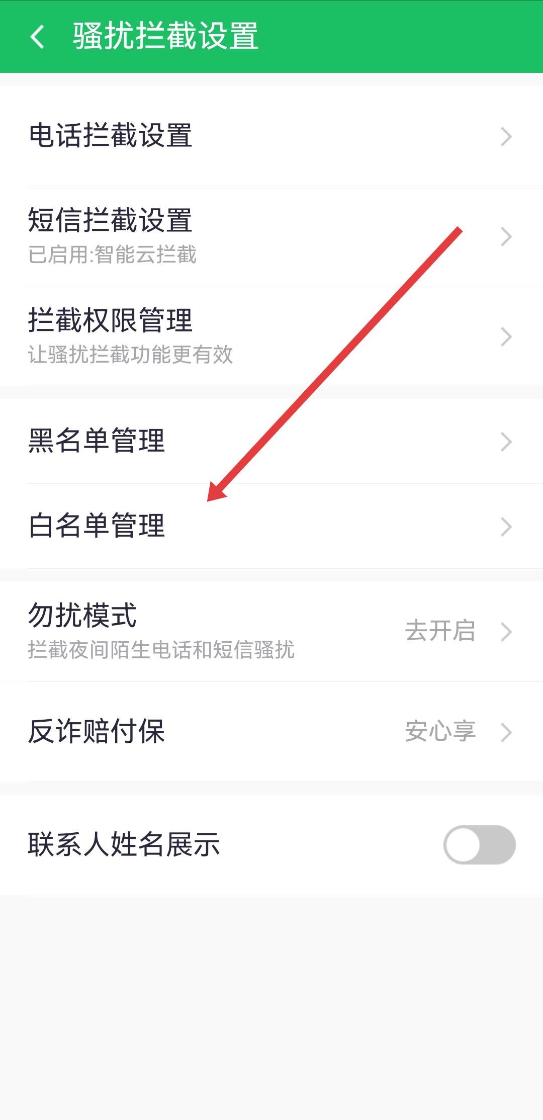 2、在骚扰拦截设置的页面中,点击白名单管理的选项,进入白名单的管理页面。