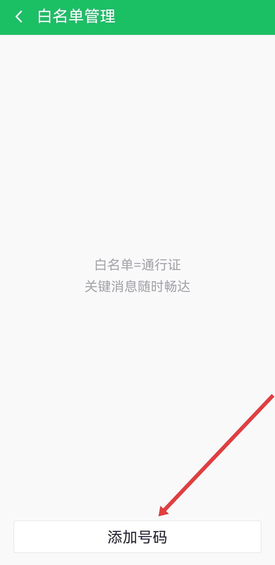 3、在白名单管理页面,点击底部的添加号码按钮,可以将需要的号码添加至白名单。