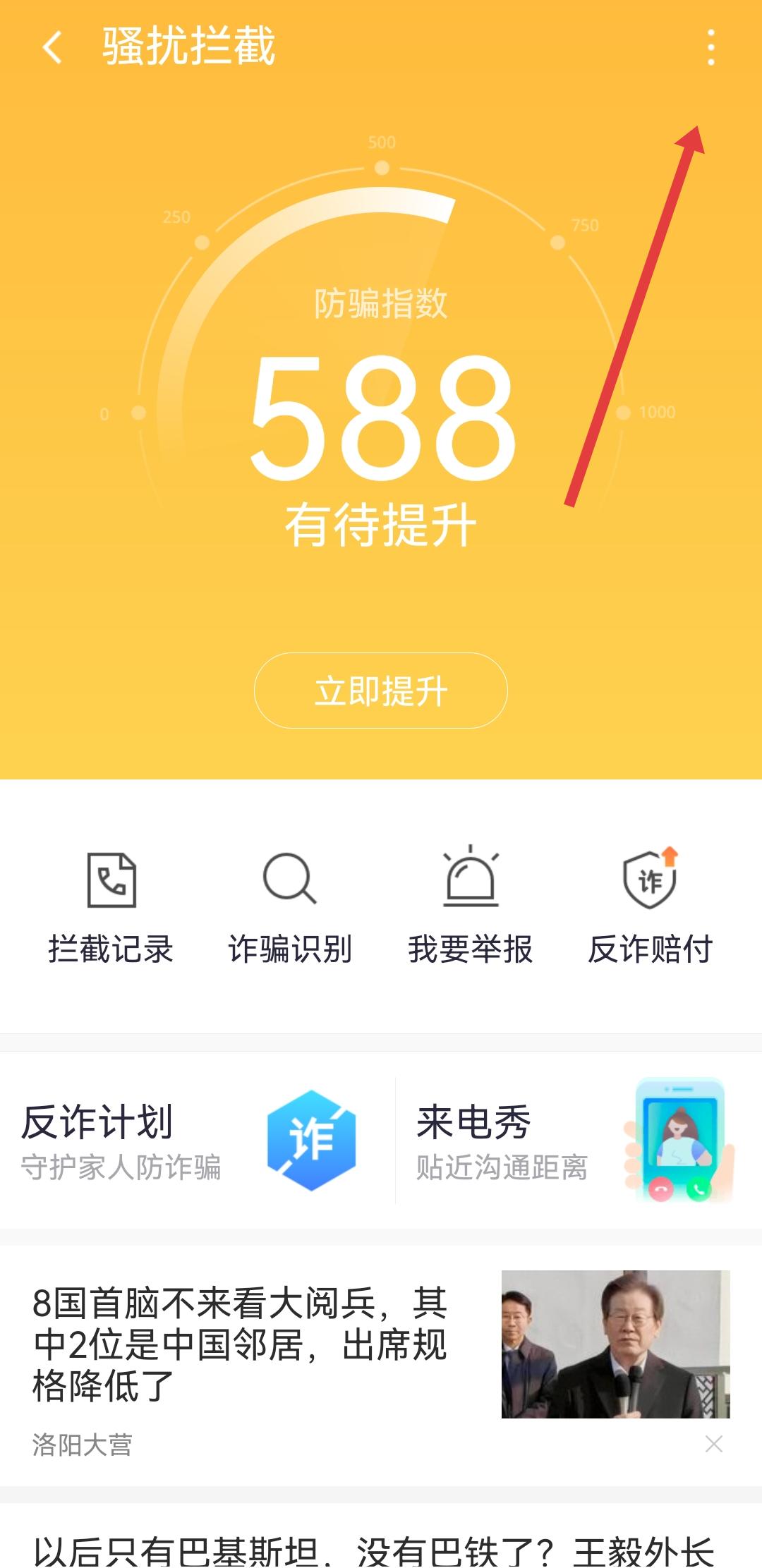 1、进入360手机卫士的骚扰拦截页面,点击右上角的三点菜单图标,进入骚扰拦截设置界面。