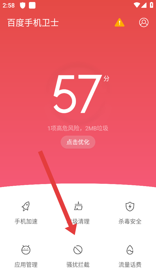 1、打开百度手机卫士APP,在首页功能区点击骚扰拦截选项,进入骚扰拦截的界面。