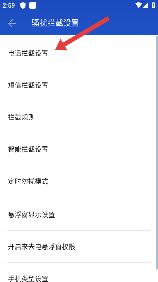 3、在骚扰拦截设置的页面中,选择点击电话拦截设置的选项,即可以配置电话拦截的规则。