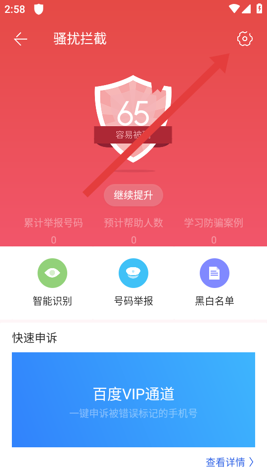 2、在骚扰拦截的页面,需要点击右上角齿轮状设置的图标,进入骚扰拦截设置的页面。