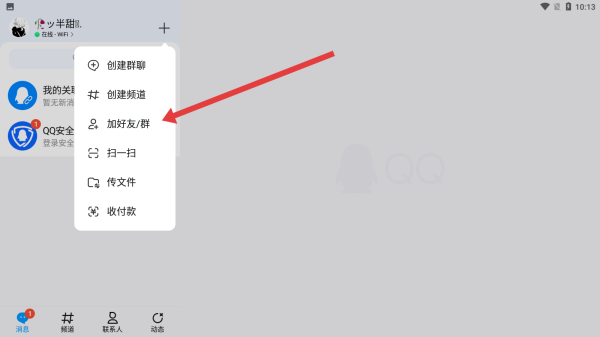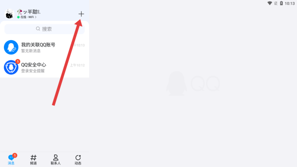1、在qq主页中点击上方的+号按钮,展开更多功能。