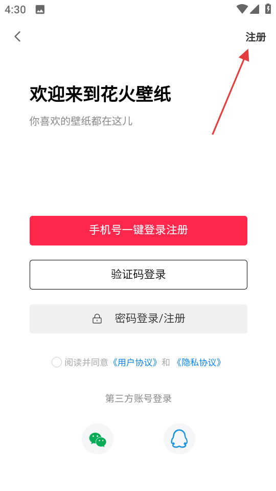 3、在登录界面,点击右上角注册,进入注册相关页面。