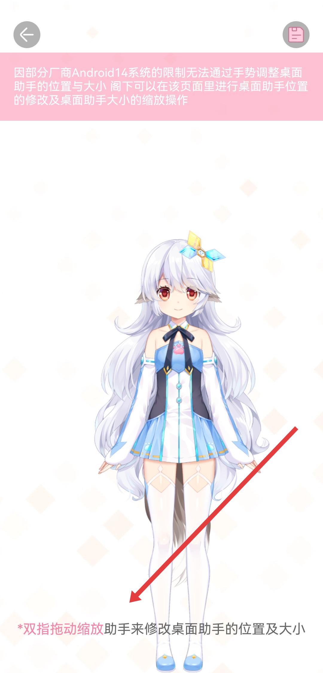 4、在助手调整页面,按照提示双指拖动缩放助手,通过双指操作来修改桌面助手的大小。